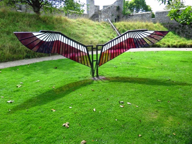 This summer there was an exhibition of 'angel wings' in the grounds of the Bishop's Palace in Wells.  They looked gorgeous in the sun.  You could take a photograph in front or behind them and look like an angel... but unfortunately you could never fly off, as the wings are made of very heavy glass and metal, giving them a stained glass look.